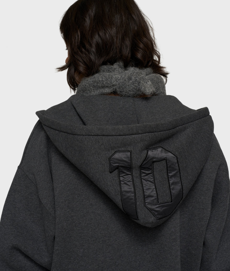Oversized Fit Statement Hoodie mit Reißverschluss aus angerautem Baumwollfleece. Kapuze mit „10“-Aufnäher, Rippenstrickbündchen, einem tiefen Schulteransatz und einem Reißverschluss