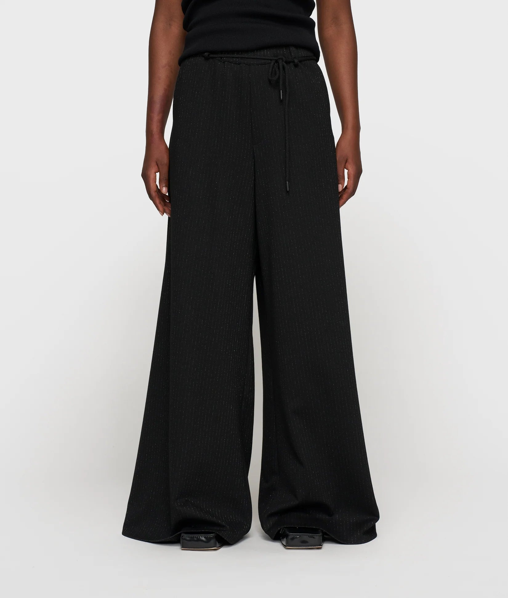 Relaxed Fit Nadelstreifenhose mit weitem Bein, gefertigt aus einem geschmeidigen Viskosemix. Mit einem elastischen Taillenbund mit Kordelzug, schrägen Eingrifftaschen, Streifen mit Glitzerdetail, einer angedeuteten Gesäßtasche und einem unterhalb der linken Eingrifftasche aufgestickten „10“-Monogramm.