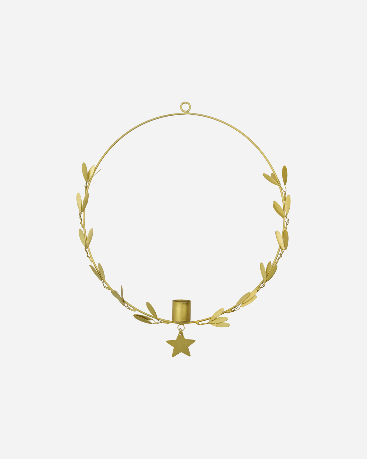 Kerzen sind nicht nur auf dem Tisch ein Hingucker. Mit diesem Kerzenhalter von House Doctor kannst du zu Weihnachten das Licht von der Decke hängen lassen. Der hängende Kerzenhalter mit Messingoptik, Blättern und einem Stern lässt sich prima oben mit einem Band schmücken. Danach einfach eine LED-Kerze hinzufügen und fertig ist der elegante Blickfang. Ideal für Ecken in der Wohnung, die keinen Platz für normale Kerzenhalter bieten. Für einen persönlichen Ausdruck, den Ring mit leichtem Schmuck oder ein paar Zweigchen dekorieren. Aufgrund der Größe des Kerzenhalters, empfehlen wir LED-Kerzen von maximal 16 cm. (LED Kerzen von Uyuni findest du bei uns im Shop)