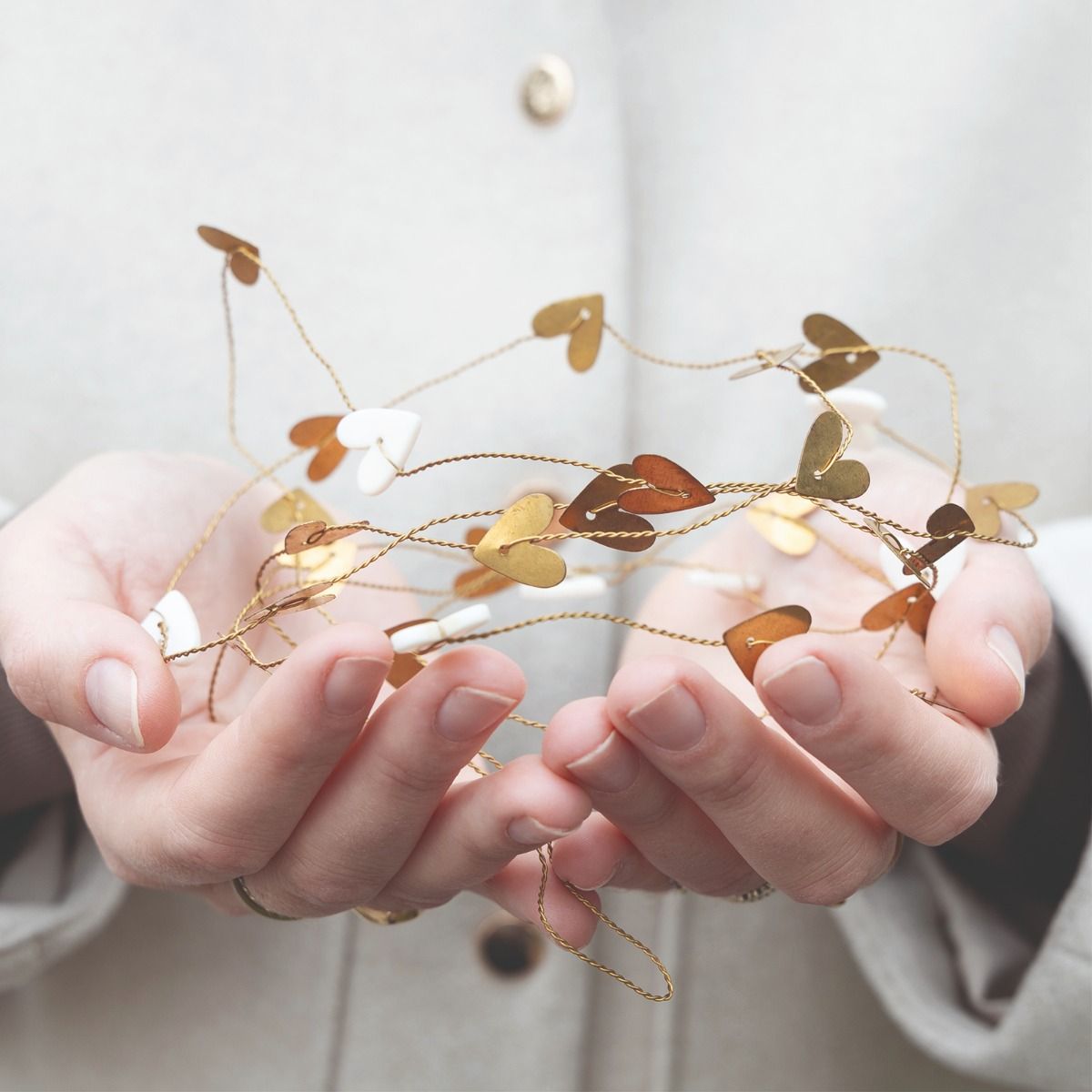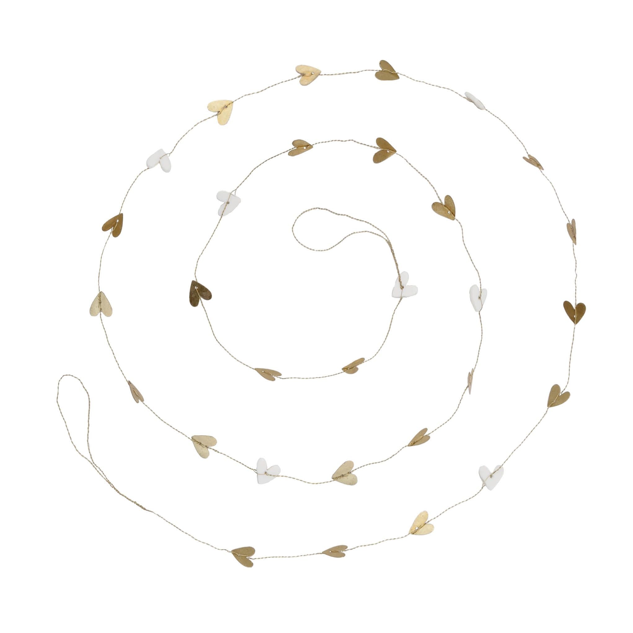 Elegante Girlande aus Metall und Keramik von Bastion Collections mit weiß-goldenem Herzdesign. Die 180 cm lange Dekoration verbindet hochwertige Materialien mit zeitlosem Charme und schafft eine warme, einladende Atmosphäre in jedem Raum. Perfekt für Wohnzimmer, Schlafzimmer oder als stilvolles Geschenk. Die Kombination aus Gold und Weiß passt zu verschiedenen Einrichtungsstilen und bringt einen Hauch von Eleganz in Ihr Zuhause.