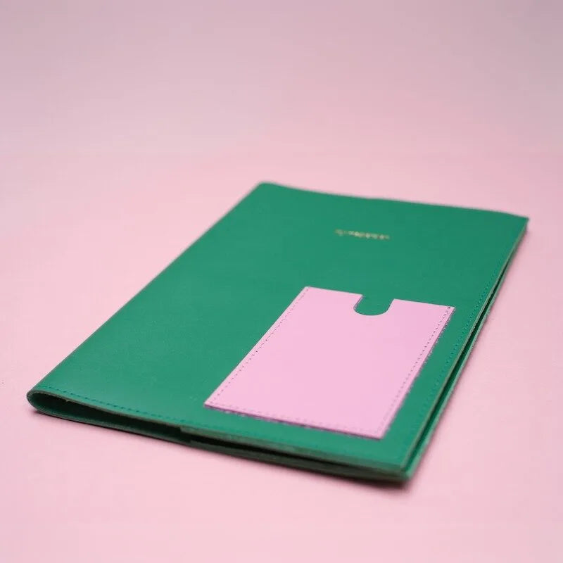 Schöne feste Lederhülle für Softcover-Notizbücher mit einer Tasche auf der Vorderseite in einer hellen Kontrastfarbe. Alle Softcover-Notebooks im A5-Format passen in dieses Cover.