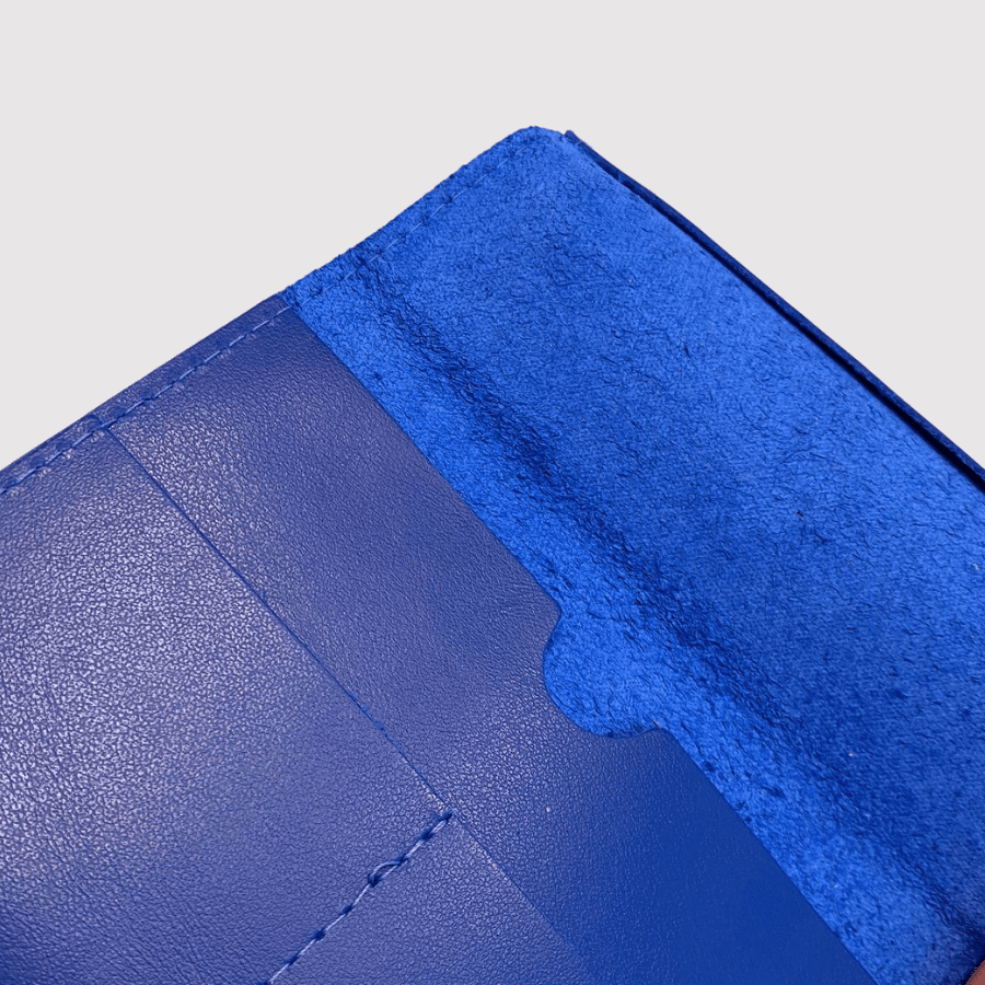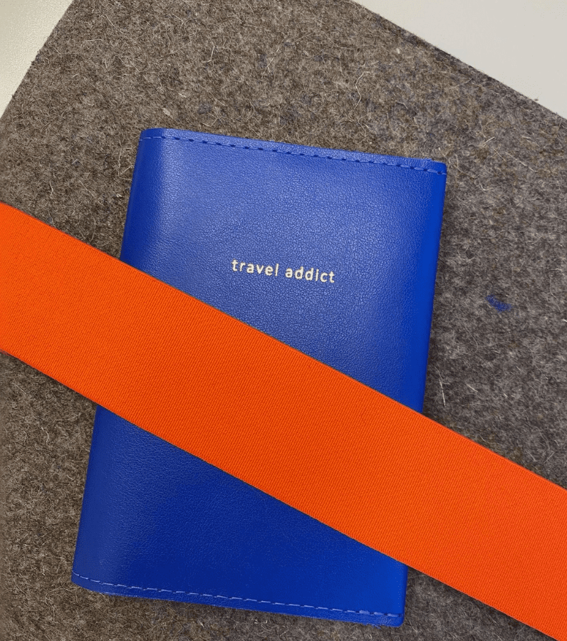 Passhalter aus weichem Leder, ideal für Reisen, da er auch Ihre Karten und Tickets halten kann. Auf der Reisepasshülle finden Sie das Reisezitat "Travel Addict" in Gold.