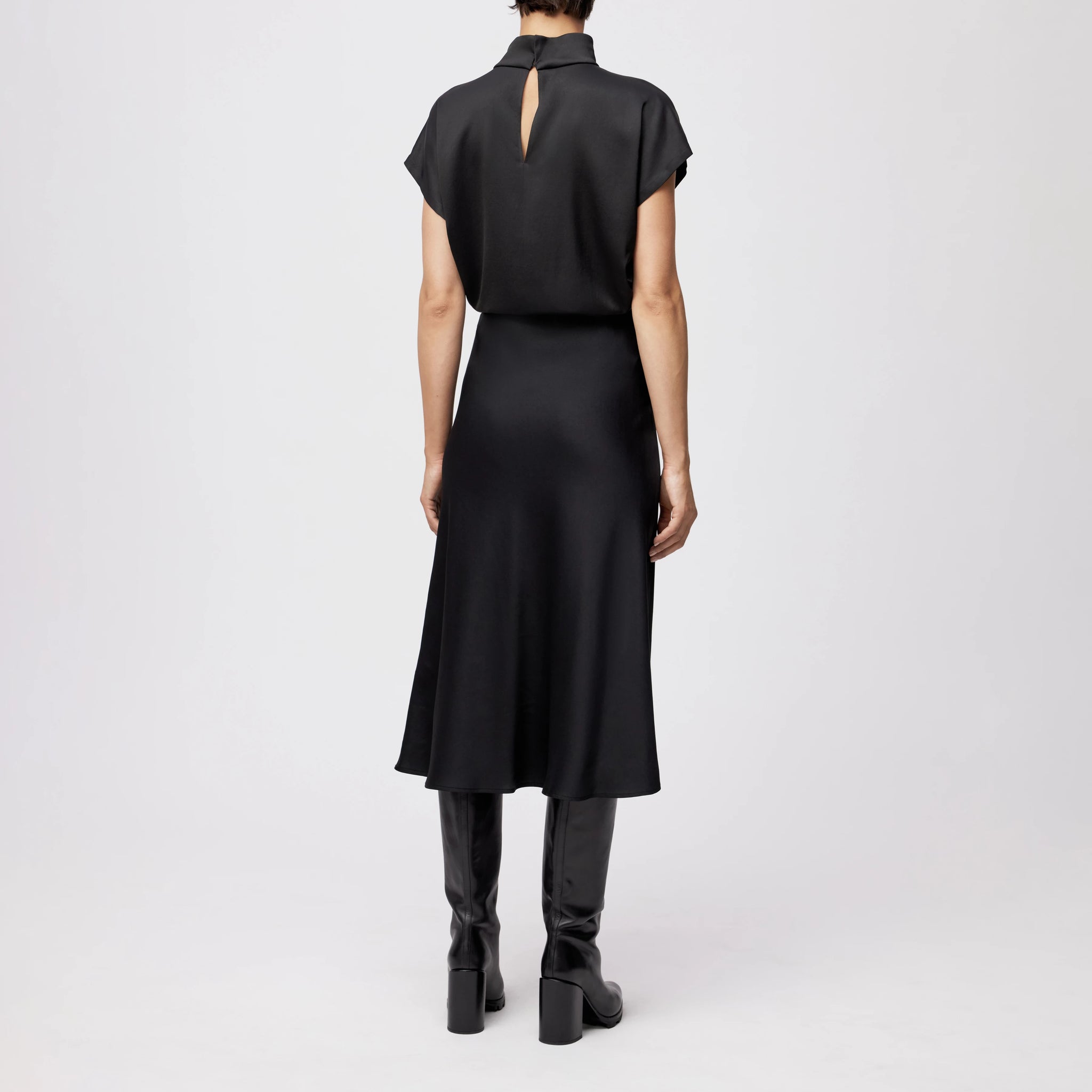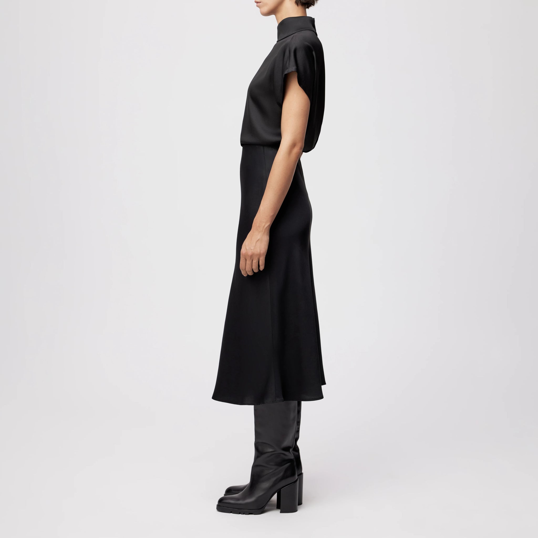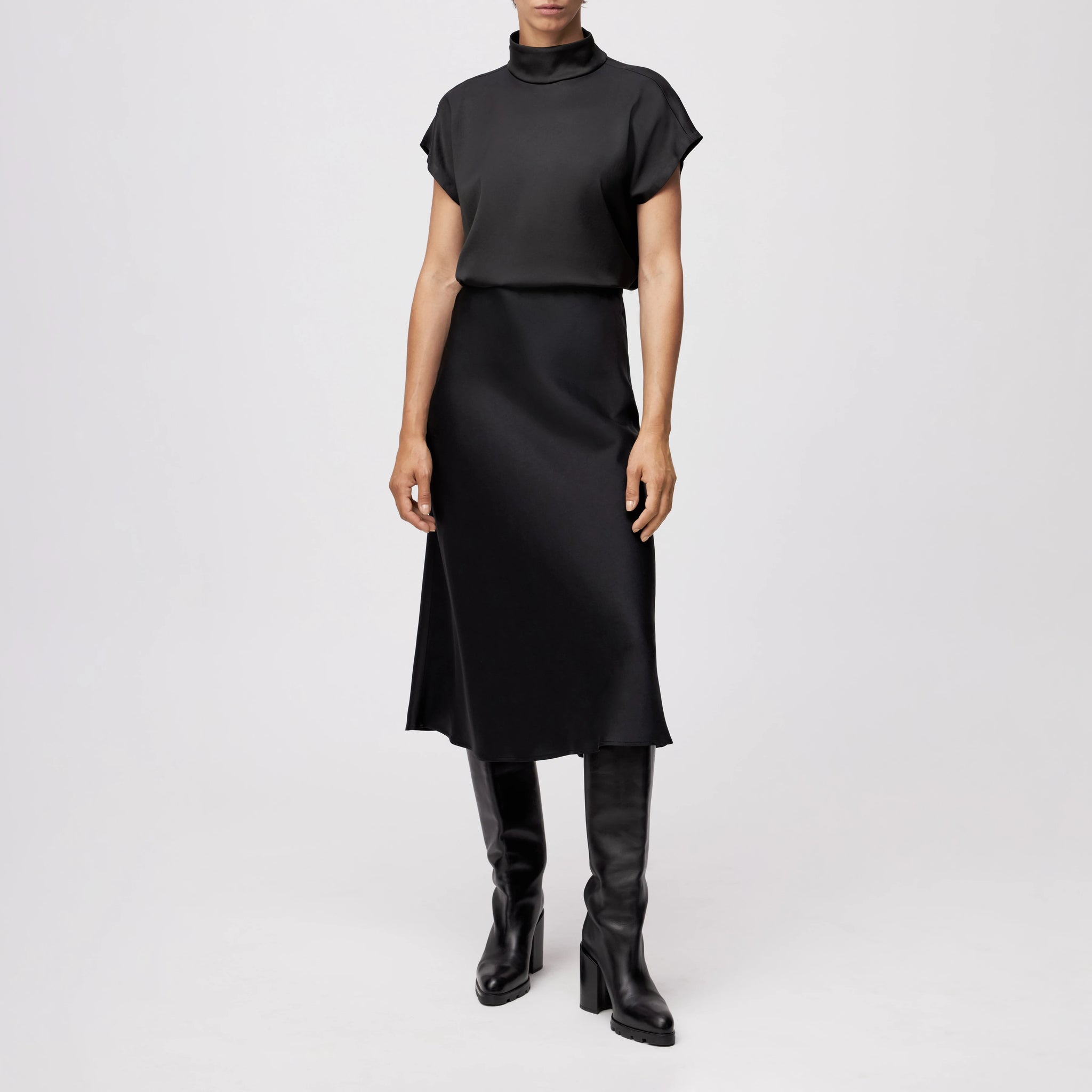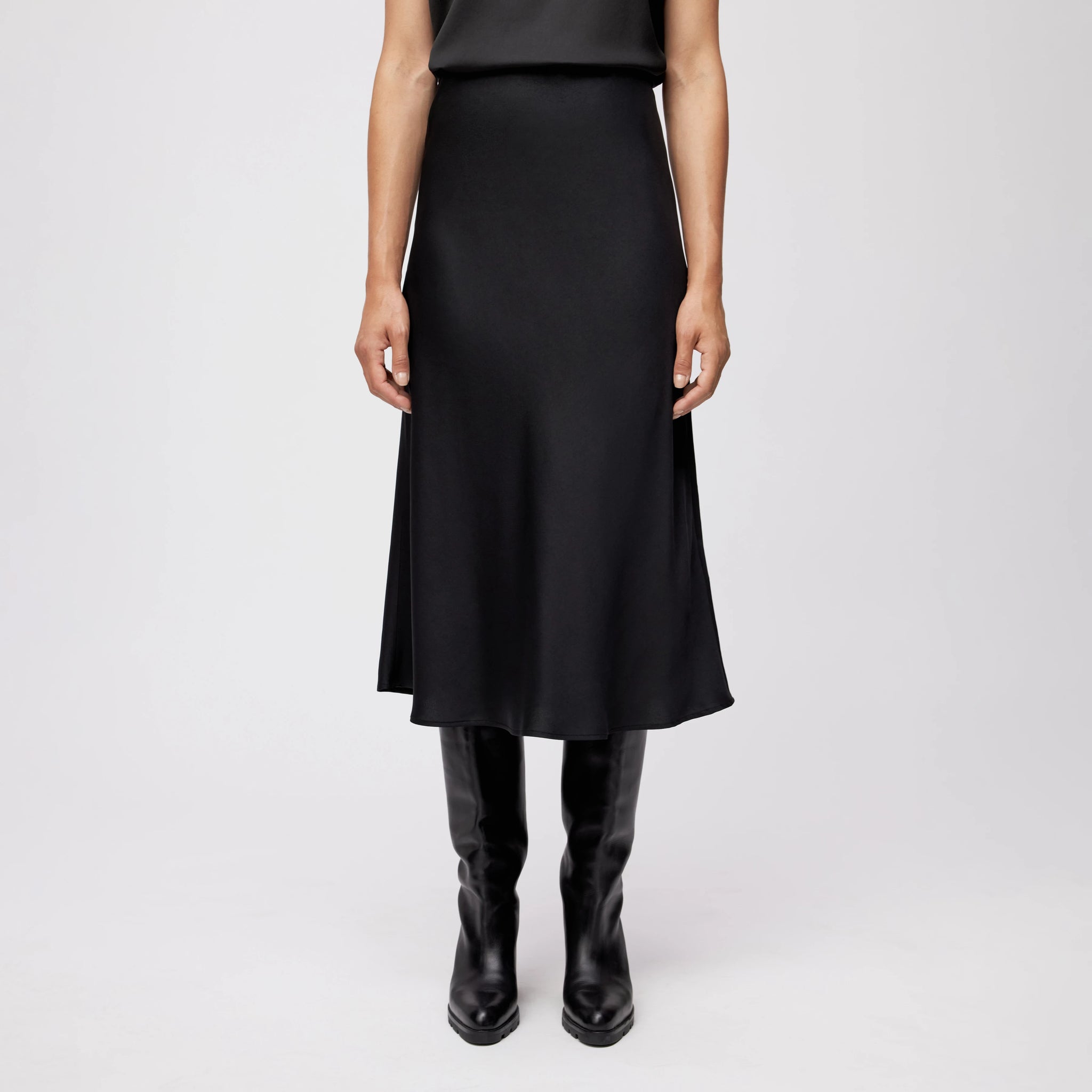 URA ist eleganter Slip-Skirt in Midilänge. Der feminine A-Linien Rock wird Mid-Waist getragen. Der zeitlose Stil bietet eine Vielfalt an Kombinationsmöglichkeiten. Gefertigt aus einem hochwertigem und fließendem Satin.