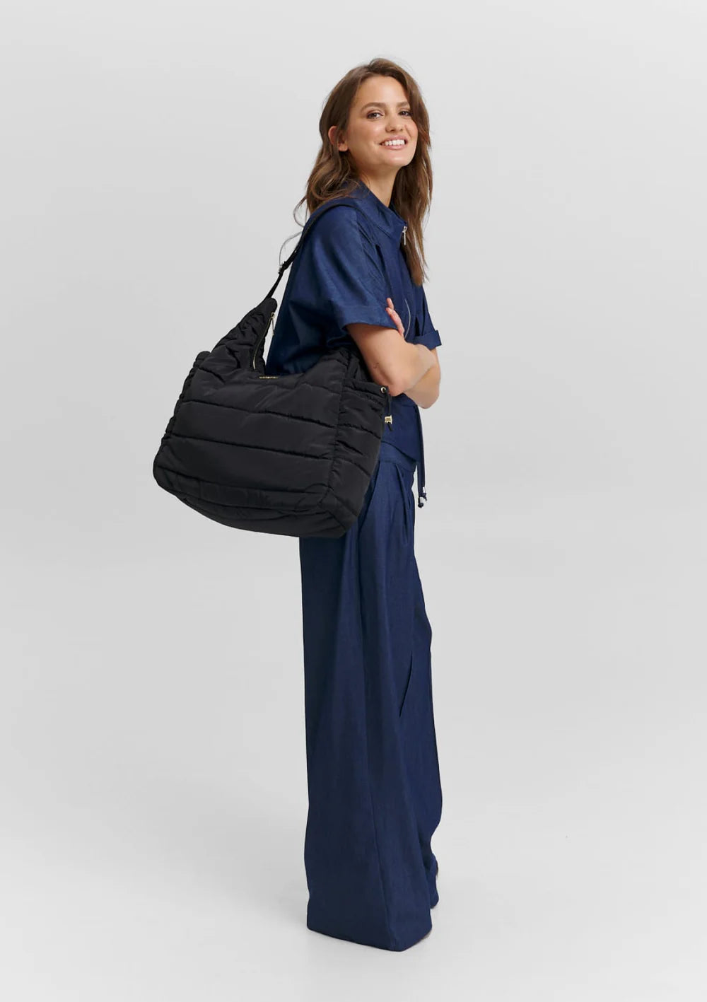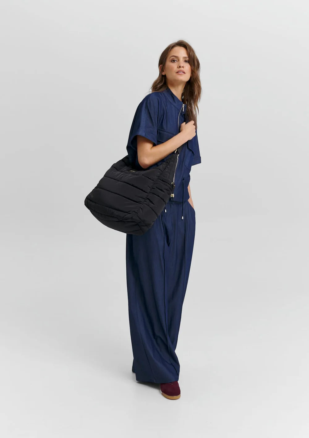 Das softe Material bleibt angenehm leicht, während die cleane Silhouette mit Reißverschluss, verstellbarem Strap und strukturiertem Innenleben punktet. Zwei seitliche Außenfächer mit Kordelzug, ein Reißverschlussfach innen sowie weitere kleine Fächer sorgen für Ordnung – ganz gleich, was dein Tag bereithält.
