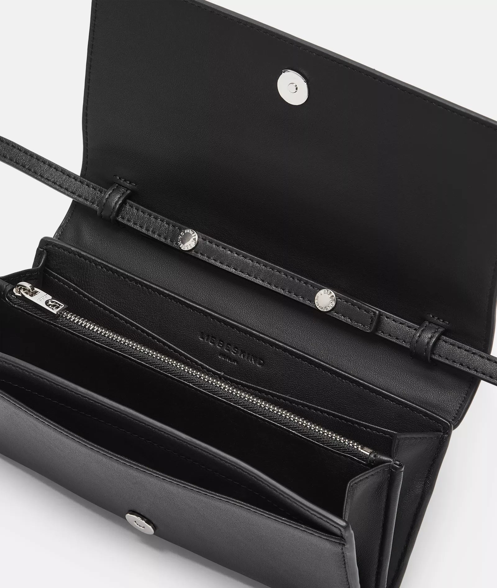 Details : Überschlag mit magnetischem Druckknopfverschluss, Innenraum mit zwei Fächern und jeweils vier Steckfächern, einem großem Scheinfach und einem Münzfach mit Reißverschluss, längenverstellbarer Schultergurt, Frontseite mit Logoprägung