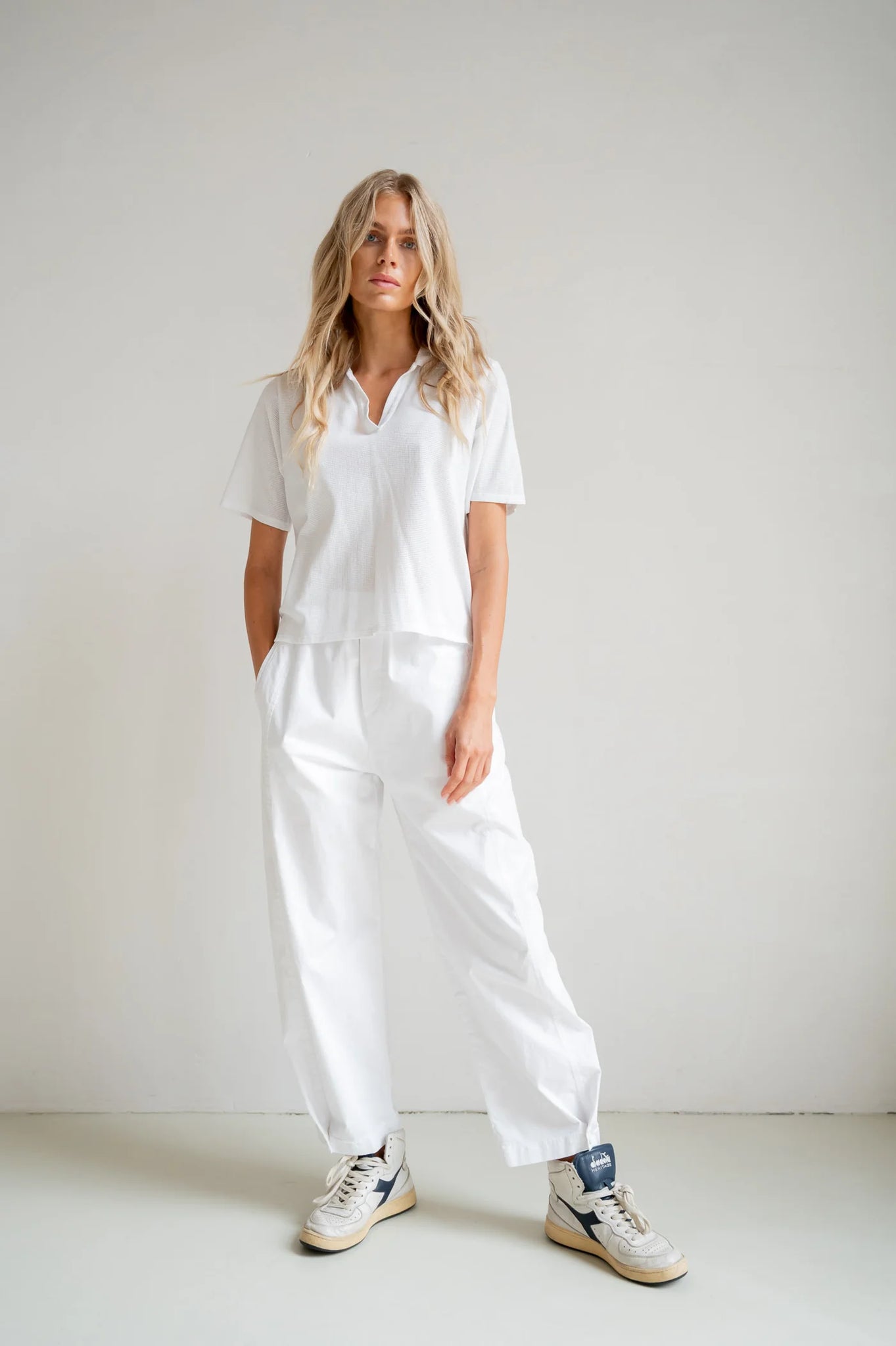 Eine moderne Interpretation einer klassischen Polo-Silhouette. Dieses leichte Oberteil hat eine entspannte Passform, ein weiches strukturiertes Material und einen offenen Kragen für einen mühelosen, raffinierten Look. Perfekt für warme Tage oder einfachen Lagenlook, kombiniert Komfort mit dezentem Stil.