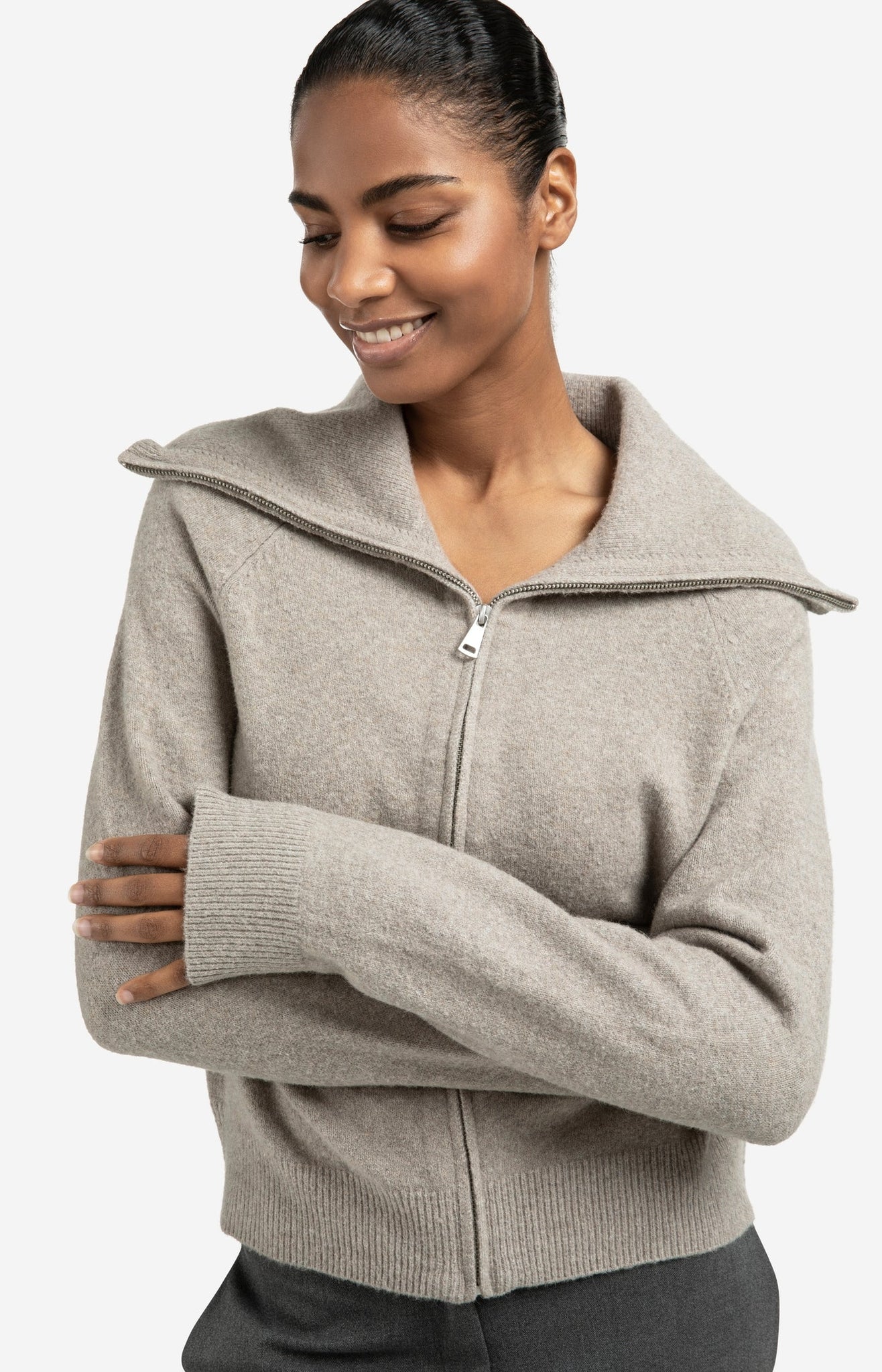 Dieser bequeme Cardigan aus weichem Stoff hat eine normale Passform. Der breite Kragen gibt ihm eine moderne Note, und der Reißverschluss auf der Vorderseite ist äußerst praktisch. Die langen Ärmel, die gerippten Bündchen und der gerippte Saum verleihen dem Cardigan einen raffinierten Touch. Die perfekte Wahl für einen stilvollen Lagenlook für die Übergangszeit.