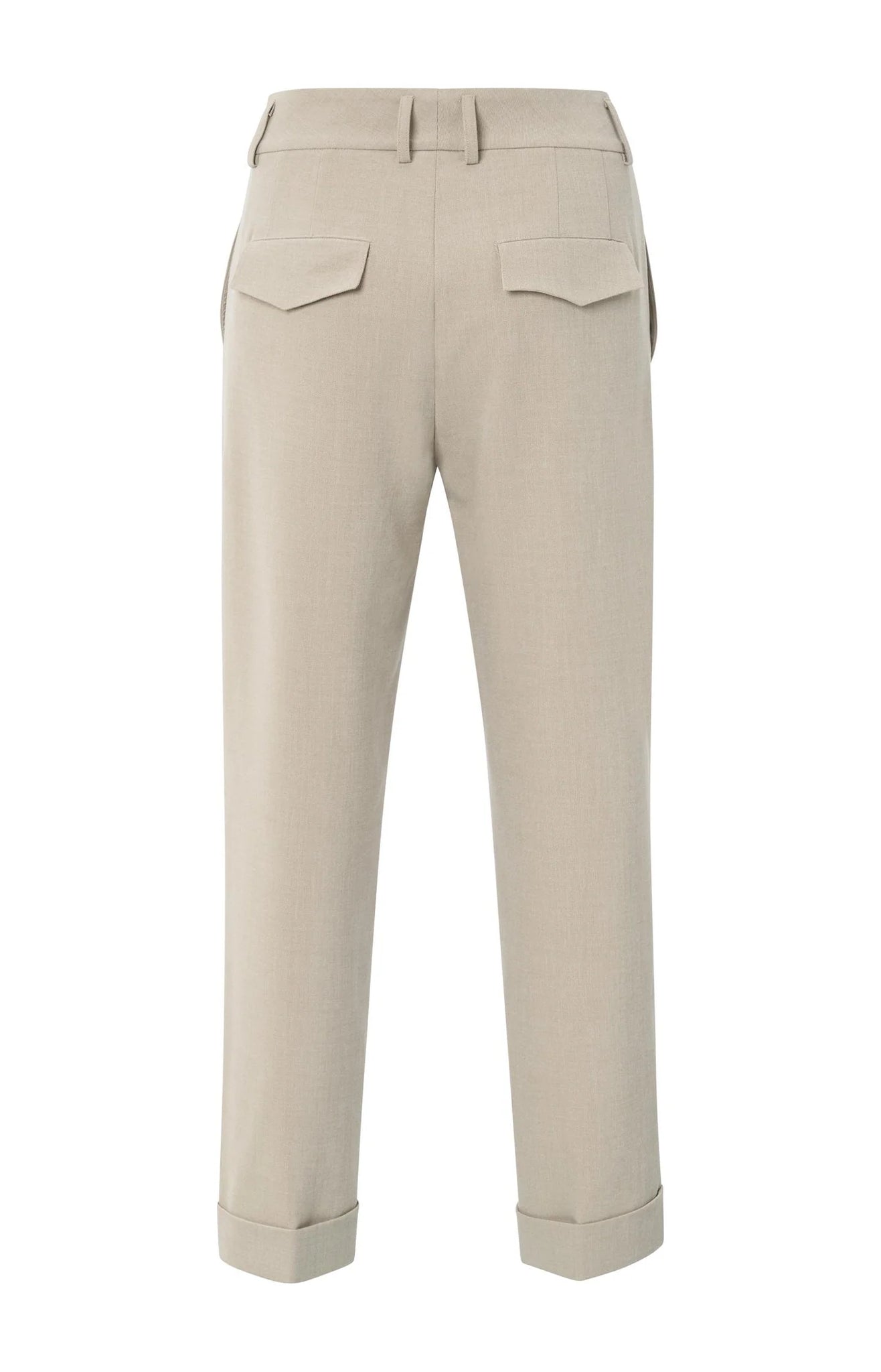 Diese elegante Hose hat eine normale Passform, einen hohen Bund, ein gerades Bein und eine schlichte, elegante Silhouette. Sie besteht aus weichem gewebtem Stoff mit dezenter Struktur. Die Hose hat Seitentaschen, Gesäßtaschen mit Knöpfen und einen doppelten Knopfverschluss auf der Vorderseite. Die festgenähten umgeschlagenen Beinabschlüsse runden den Look raffiniert ab.