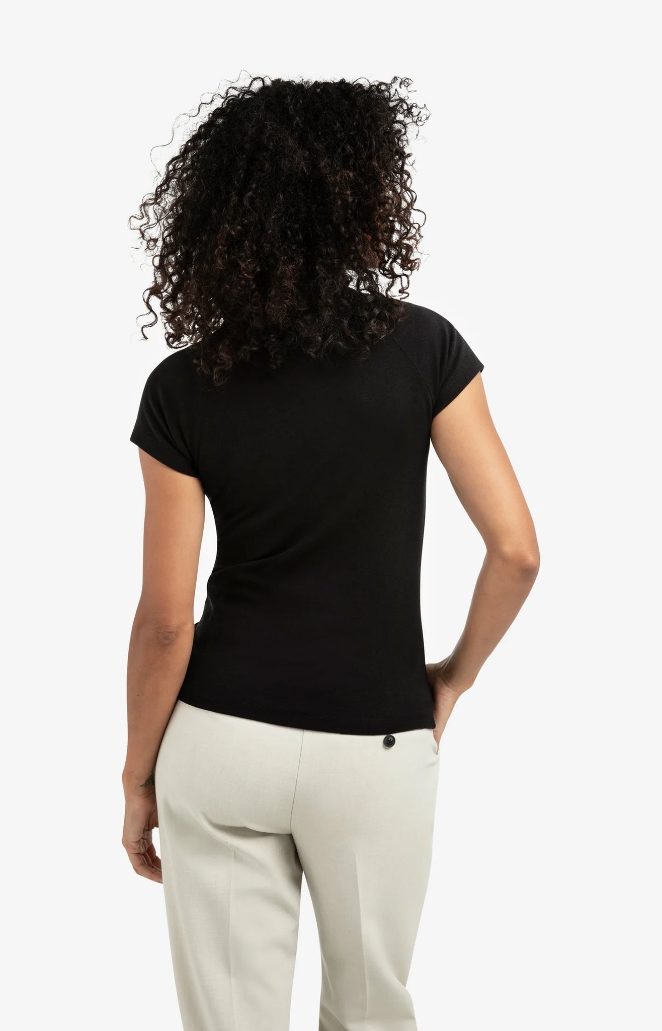 Dieses taillierte Jersey-Top ist aus einem bequemen Stretch-Material gefertigt und verfügt über kurze Raglan-Ärmel und einen hohen Ausschnitt. Es wurde für eine schmeichelhafte Passform entwickelt und eignet sich perfekt für sich allein oder unter einem Blazer oder einer Strickjacke. Ein zeitloses und vielseitiges Stück, das Ihrer Alltagsgarderobe eine raffinierte Note verleiht.