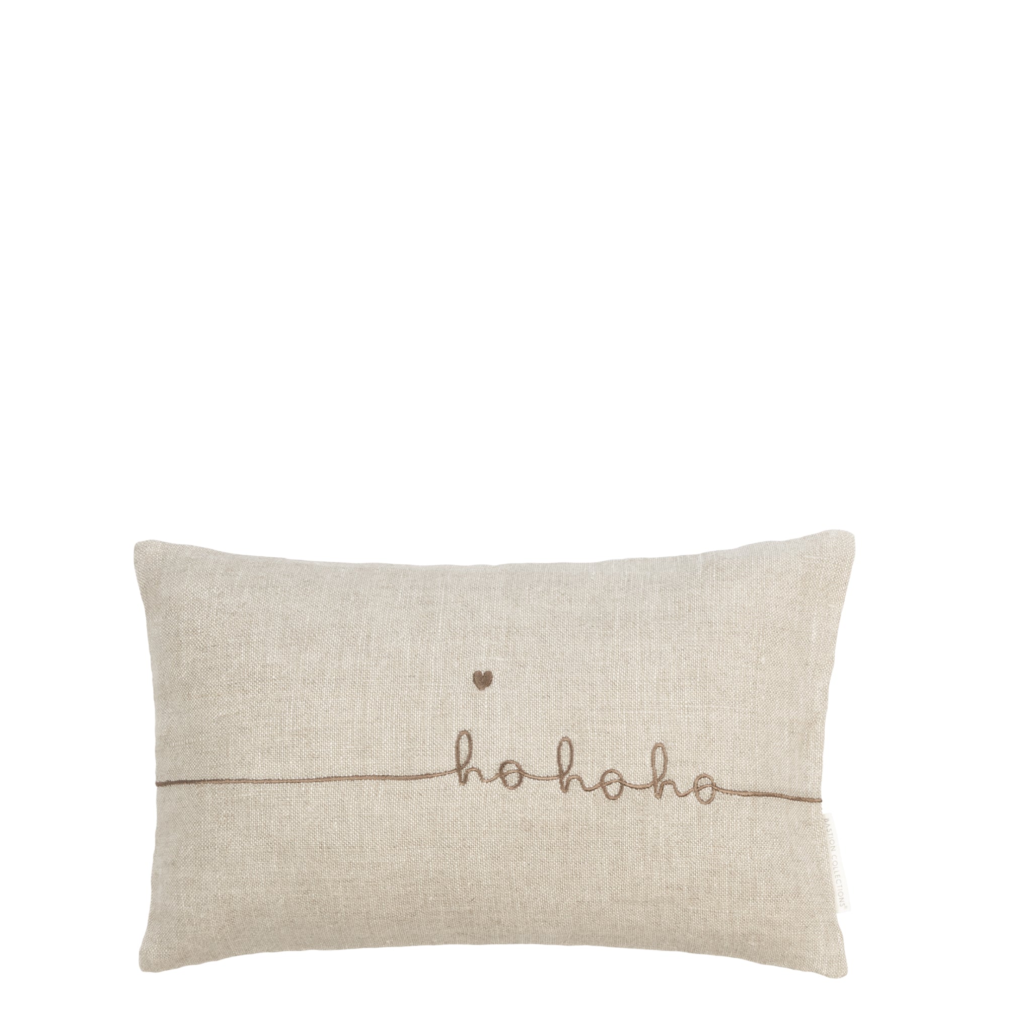Naturfarbenes Leinenkissen mit gestickten braunen Schriftzug. Inkl. Füllung.