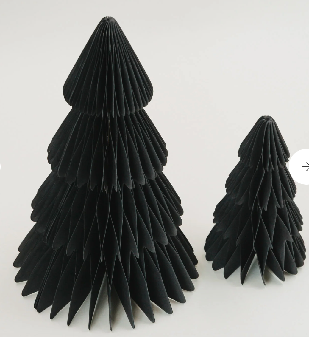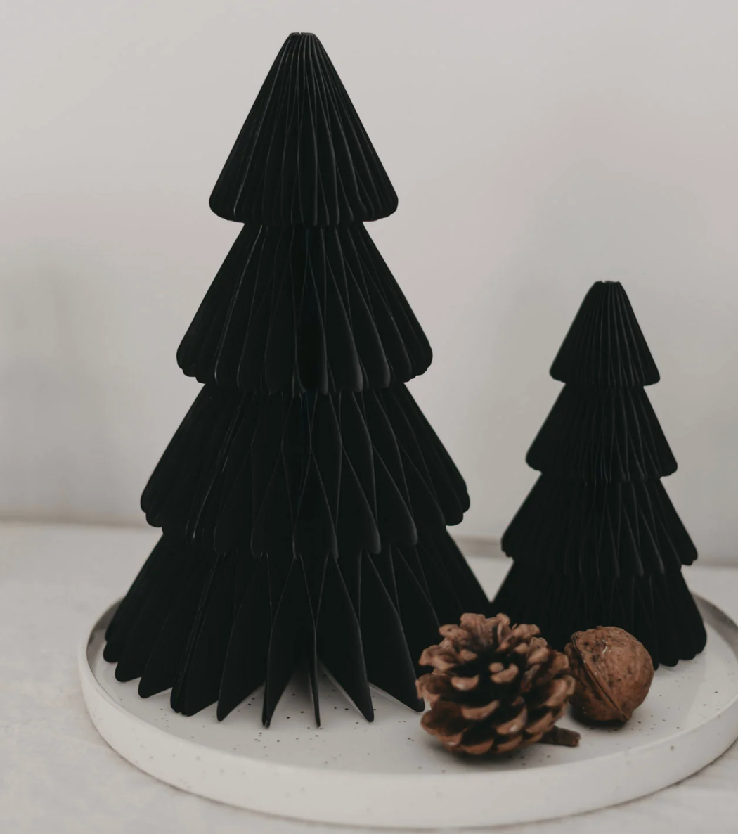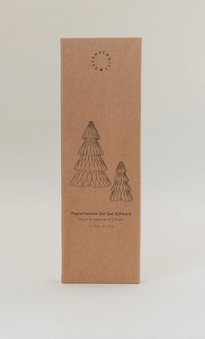 Bringe moderne Eleganz in dein Zuhause mit unserem Papiertannen 2er Set in edlem Schwarz. Die zwei unterschiedlich großen Tannen aus hochwertigem Papier in feiner Wabenoptik setzen stilvolle Akzente und fügen sich harmonisch in jede festliche Dekoration ein – ob als Blickfang auf der Festtagstafel, im Fenster, auf dem Sideboard oder als minimalistisches Detail in deiner Adventsdeko.