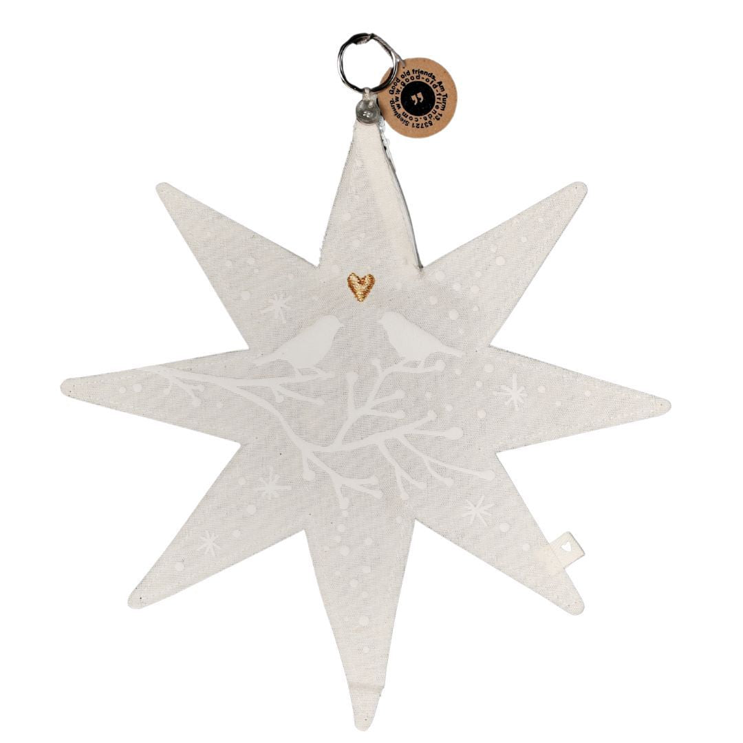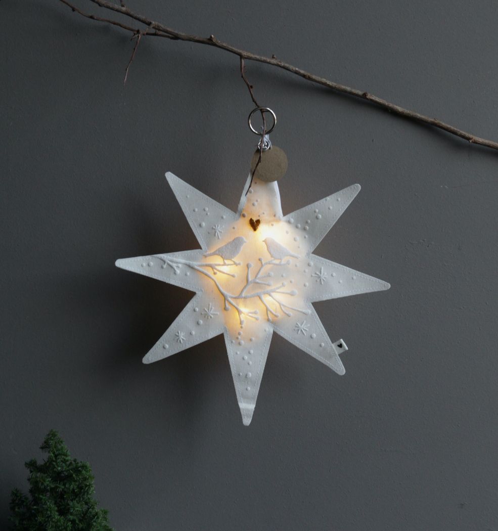 Lichtstern aus Baumwollstoff mit feinen Stickereien und zarten Druck.