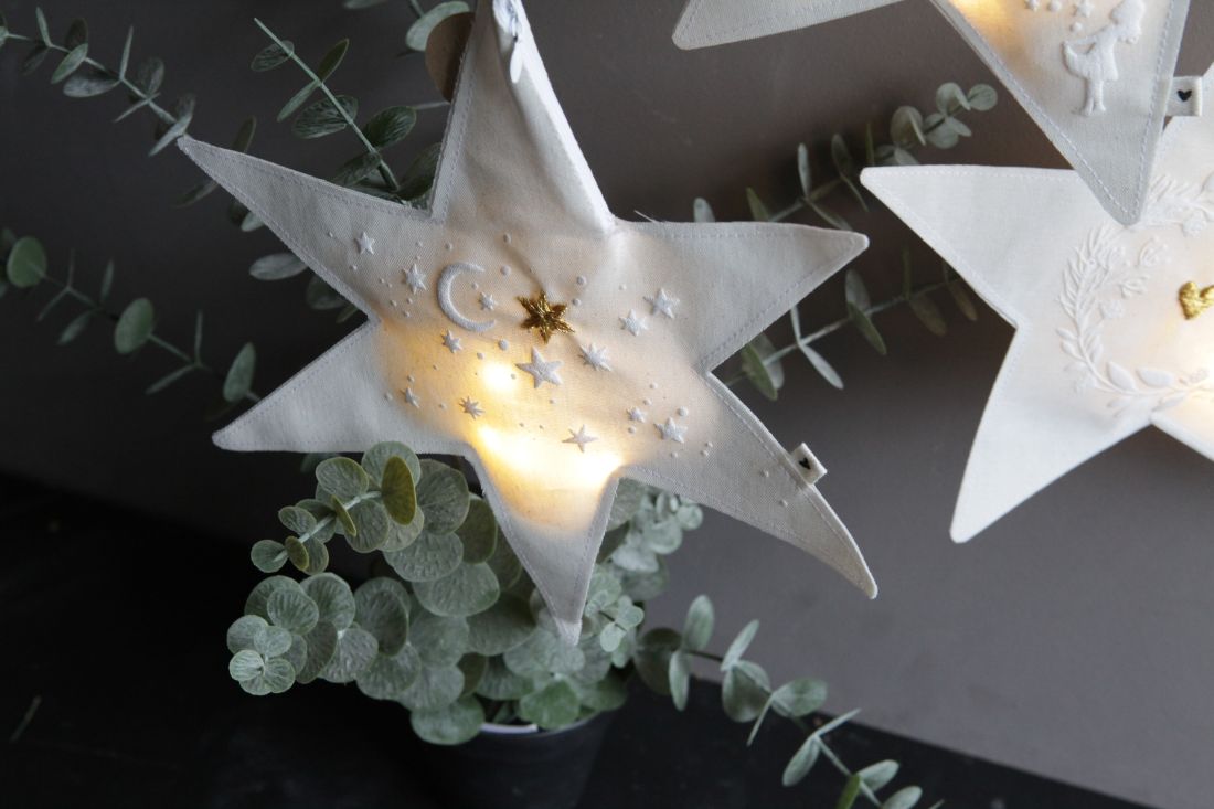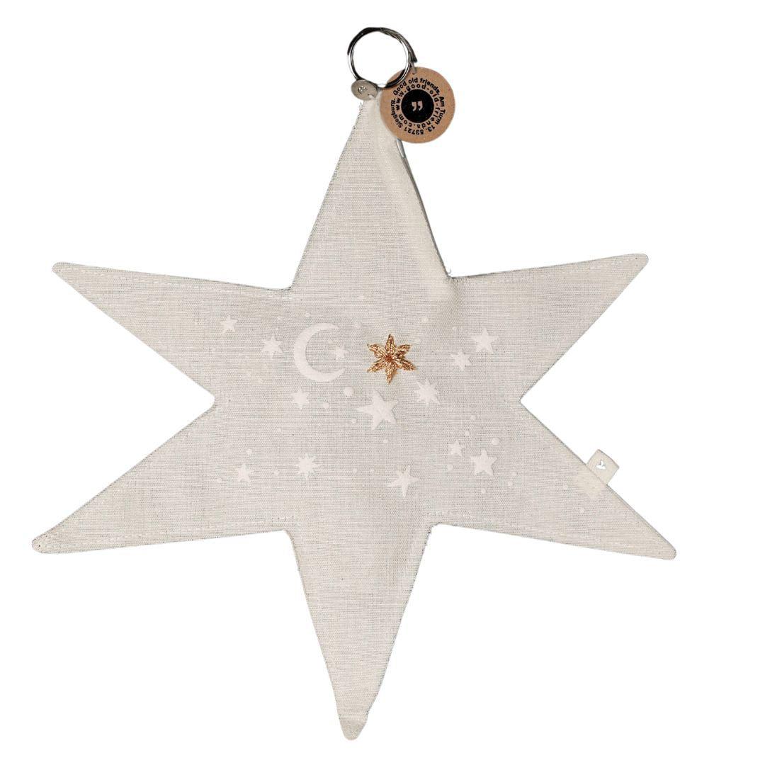 Lichtstern aus Baumwollstoff mit feinen Stickereien und zarten Druck.